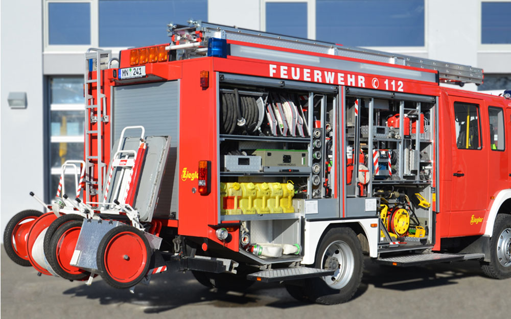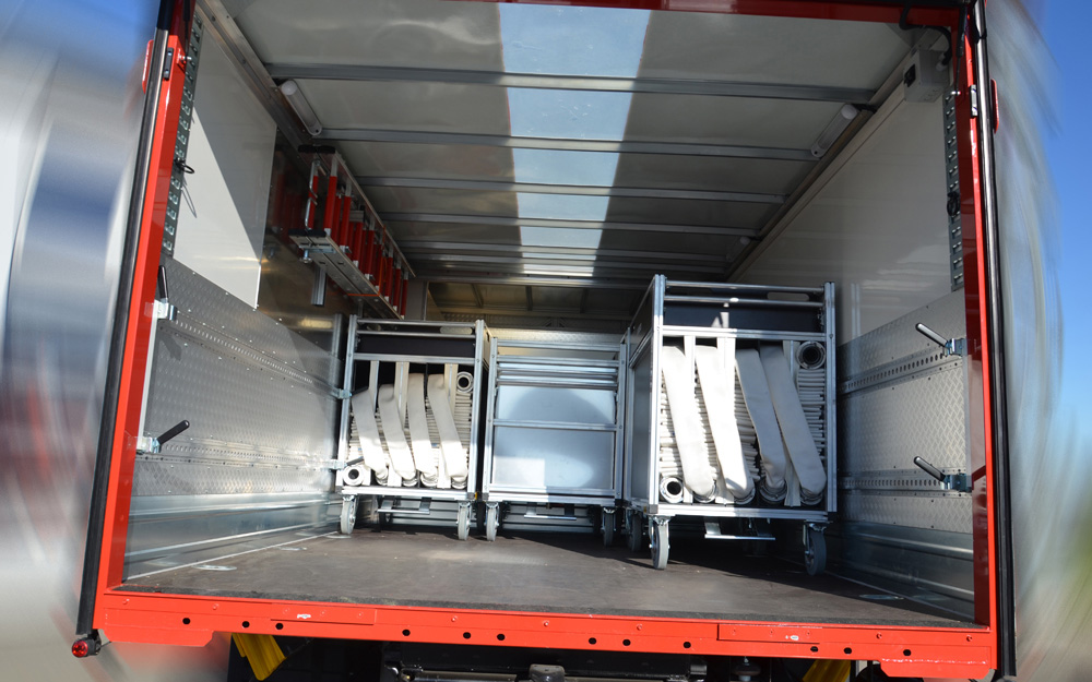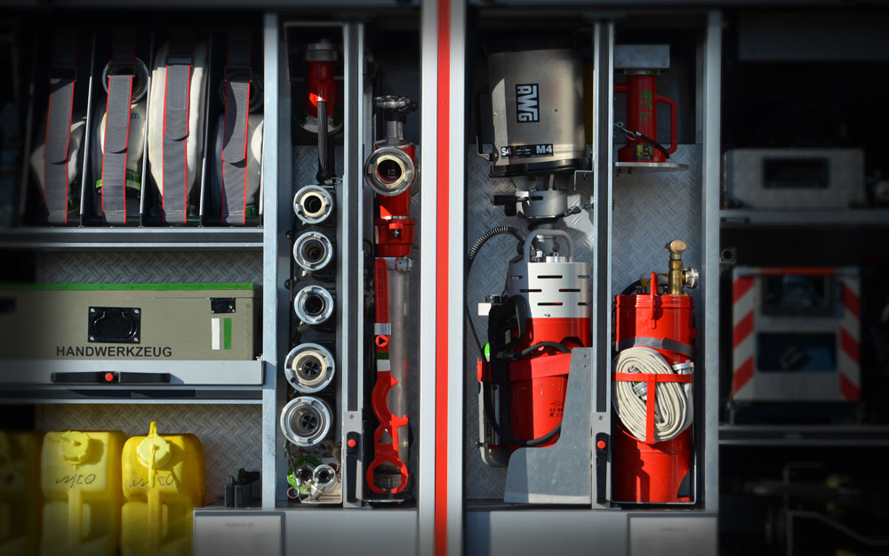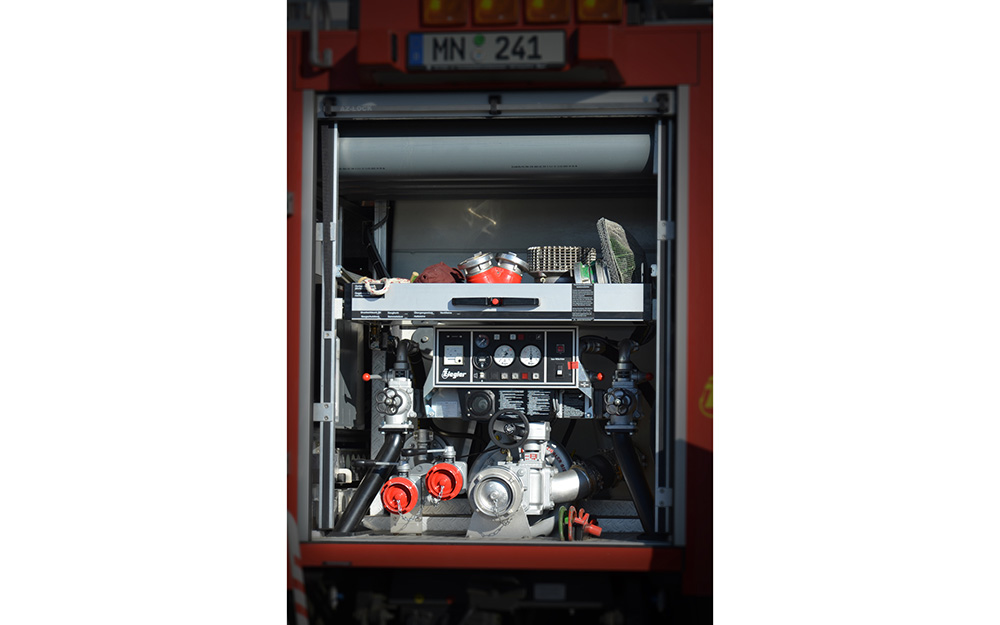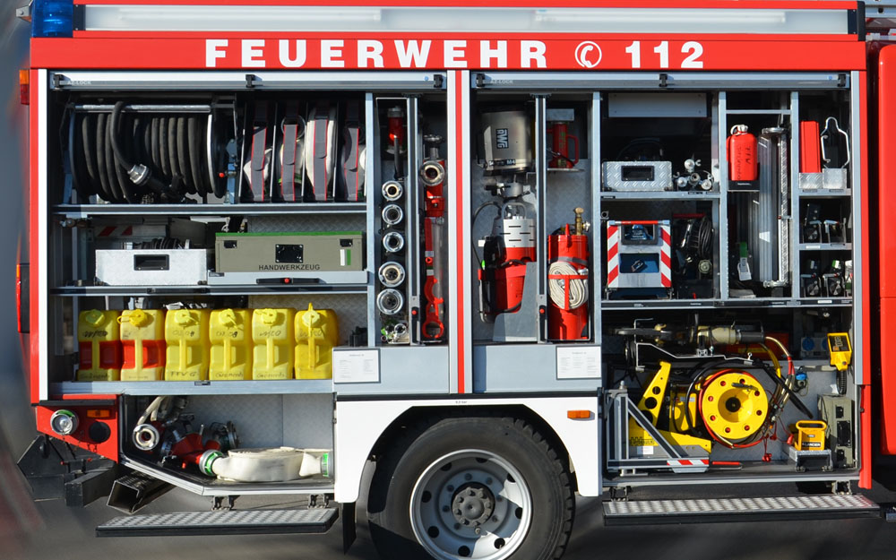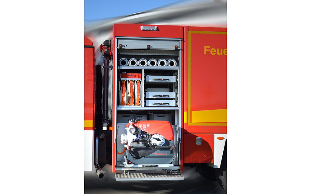 Ausrüstung für Löschwasserförderung, Brandbekämpfung und Technische Hilfeleistung; Rosenbauer FOX III PFPN 10 / 1000; 4 Schlauchcontainer zur Lagerung von mind. 500 mtr verlegebereit zusammengekuppelten (25)B-Schläuchen pro Rollcontainer; 1 Rollcontainer Hochwasser mit Tauchpumpe, Wassersauger, Kabeltrommel und 3-C-Schläuche; 1 Rollcontainer Ölbekämpfung 4 Sack Ölbindemittel, Streuwagen, Besen und Schaufel; 1 Rollcontainer Kasten zur Aufnahme von Flüssigkeiten ca. 300l; 1 Rollcontainer Atemschutz zur Lagerung für 6 PA-Geräte, 6 Atemschutzflaschen und 6 Masken; Verkehrsabsicherungseinrichtung (Leitkegel mit Blitzleuchten), Motorsäge mit Schutzausrüstung (Helm mit Gehörschutz und Schnittschutzkleidung); Tragbarer Stromerzeuger (Eisemann BSKA 9E) 9 kVA und 1 Kabeltrommeln; Multifunktionsleiter mit divers. Zubehör; Diverse Kleinteile und Ausrüstungsgegenstände (Armaturen, Strahlrohre, Werkzeug, Leinen, Schaufeln, Besen, Hitzeschutzkleidung, Rettungstuch, , Pulverlöscher, Ölbindemittel, Wathosen)